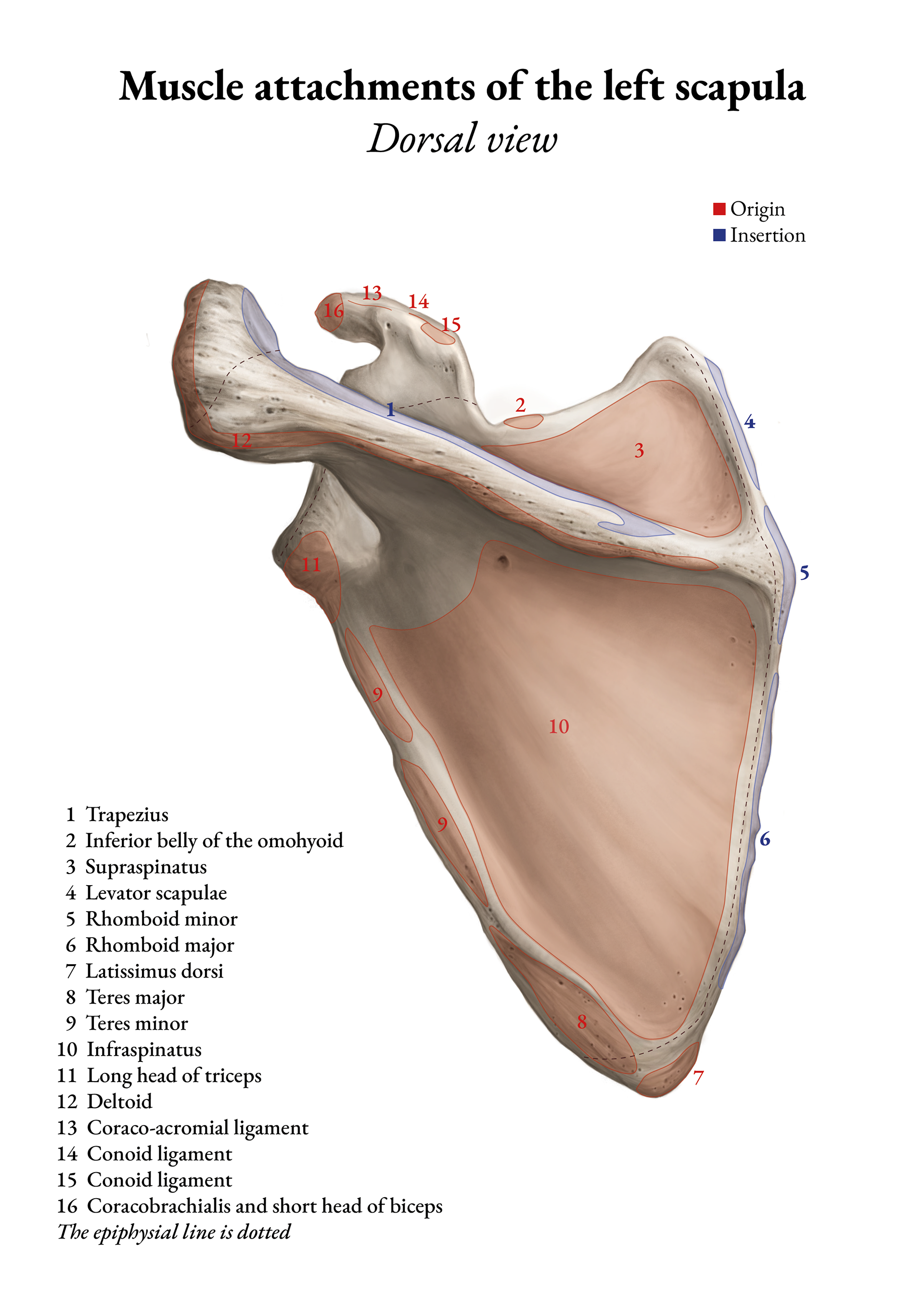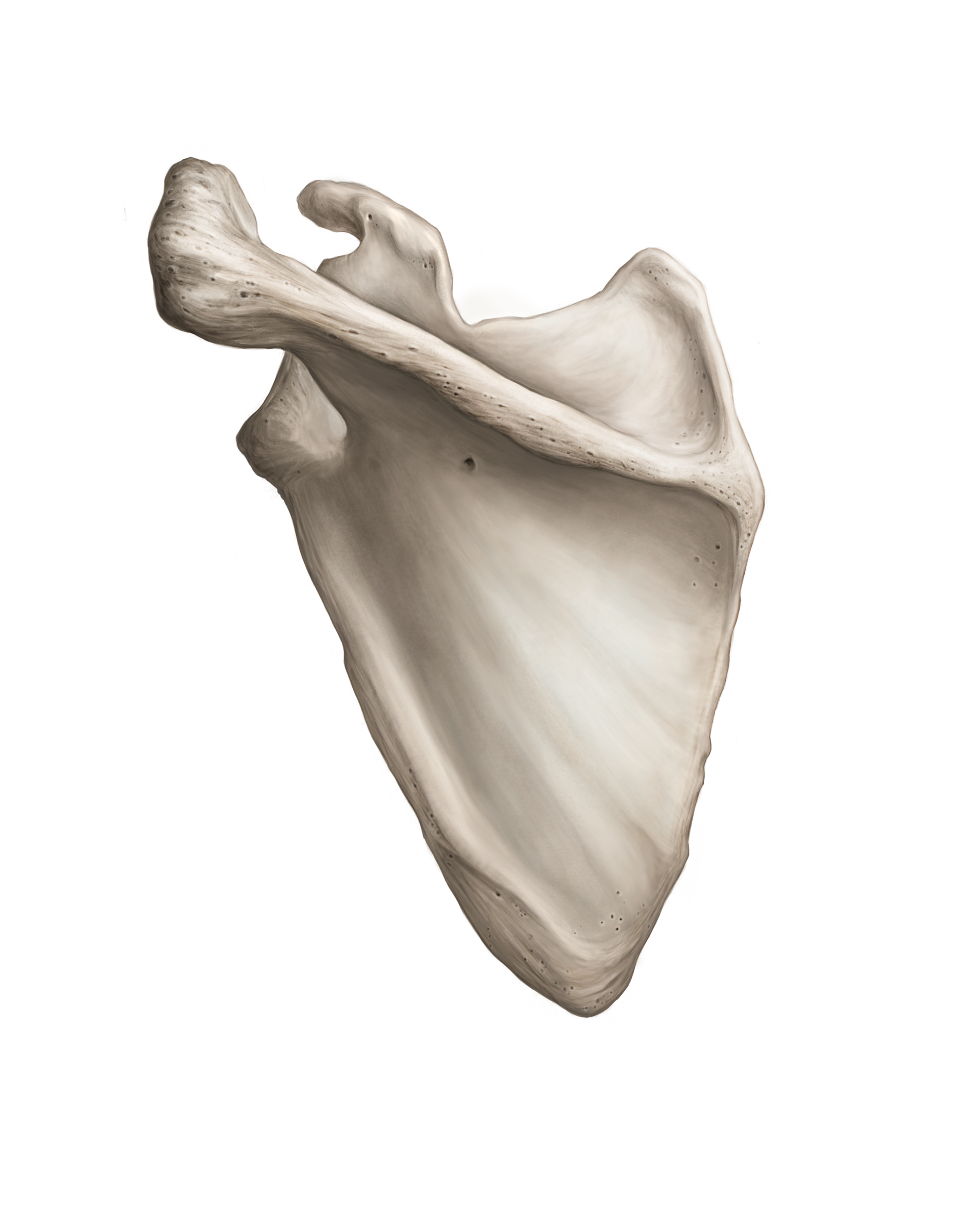 Continuous tone study of the dorsal surface of the left scapula in Photoshop, with annotations added in InDesign.